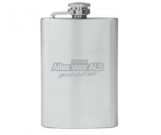 Deze mooie metallic heupfles met het logo van AllesvoorALS Gramsbergen kan gevuld worden met 100ml van jouw favoriete drankje.