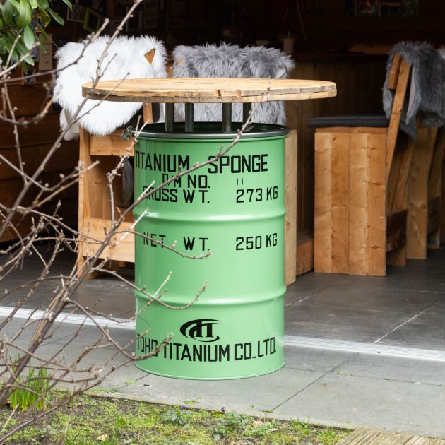 Dit omgebouwde olievat is mooi groen en met tekst overgespoten en bevat een houten blad, gemaakt van kabelhaspel.